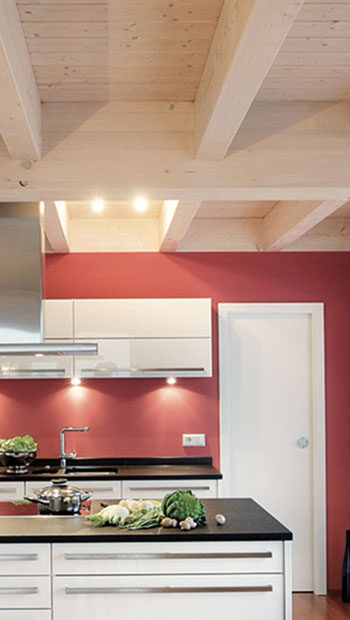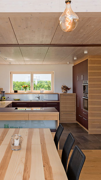 Auch bei der Gestaltung der Außenfassade und der Innenwände haben Sie die freie Wahl der Materialien. Der Holzrahmenbau kann zudem auch mit der Massivholzbauweise kombiniert werden. In diesem Fall werden dicke Massivholzelemente in unseren Werkshallen vorgefertigt und für Wände, Decken und Dach in das Holzskelett eingesetzt.