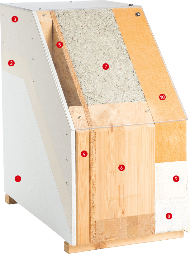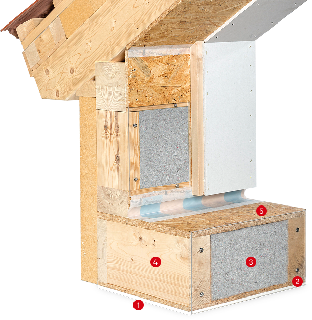 Das Grundprinzip für den Bau eines Willi Mayer Hauses ist die Holzrahmenbauweise, bei der ein tragendes Skelett mit Holz- oder Gipsfaserplatten beplankt wird. Die Dämmung kann hier über die gesamte Wanddicke eingebaut werden, wobei oftmals nachwachsende Materialien wie zum Beispiel Holzfasern, Hanf, Kork oder Schurwolle zum Einsatz kommen. Auch bei der Gestaltung der Außenfassade und der Innenwände haben Sie die freie Wahl der Materialien. Der Holzrahmenbau kann zudem auch mit der Massivholzbauweise kombiniert werden. In diesem Fall werden dicke Massivholzelemente in unseren Werkshallen vorgefertigt und für Wände, Decken und Dach in das Holzskelett eingesetzt.