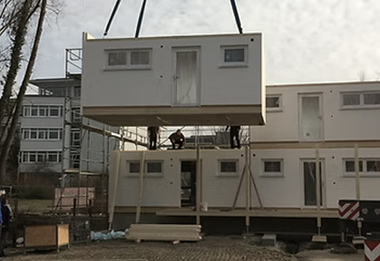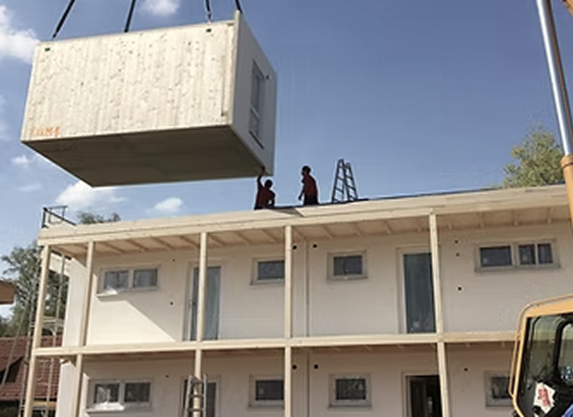 Mit unserem innovativen Holz modulbau erledigen wir den Großteil des Bauprozesses Ihres Objektes bereits in unserer Produktion. Die drei dimensionalen Raumzellen aus Holz werden komplett in unserem Werk vorgefertigt, sodass der Bauort ein reiner Montageort ist. So werden Gebäude sehr schnell industriell produziert, ganz unabhängig von Witterungsein flüssen oder anderen Begebenheiten auf der Baustelle. Die individuelle Fertigung der Module ermöglicht dabei eine flexible Grundrissgestaltung.